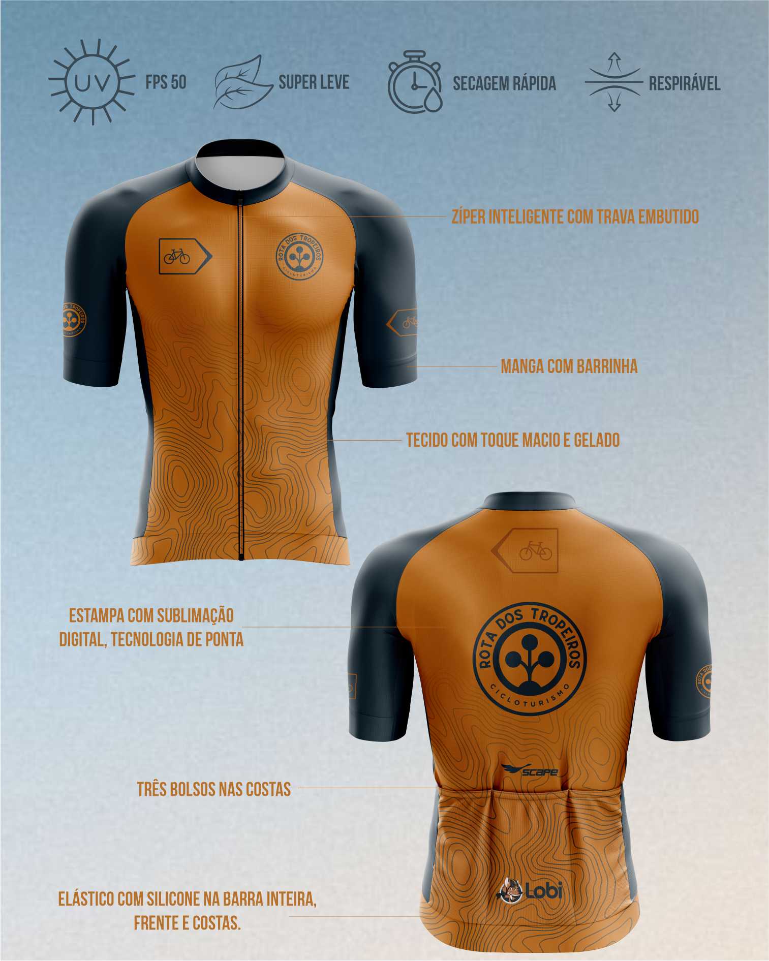 Camisa de Ciclismo Scape Rota dos Tropeiros: criada com atenção a cada detalhe, traz as cores e a essência dessa rota histórica. As mangas em tom mostarda representam o barro das trilhas, enquanto o verde escuro simboliza as florestas e as araucárias do caminho. A estampa destaca o logo da Rota, a placa que guia o trajeto e linhas que remetem à topografia das montanhas. Feita em microfibra de alta performance, oferece toque gelado, proteção UV e tratamento antimicrobiano. Modelagem confortável, zíper destacável e três bolsos traseiros com faixas refletivas garantem praticidade e segurança. Ideal para quem quer pedalar com conforto e carregar a história da Rota dos Tropeiros no corpo e na alma.